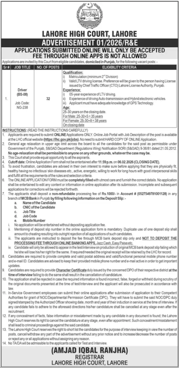 The Lahore High Court (LHC) has officially opened applications for Driver Jobs 2026 for qualified individuals across Punjab through its official portal at lhc.gov.pk/jobs. As per the latest recruitment notice, online applications are being invited for the position of Driver (BS-08).