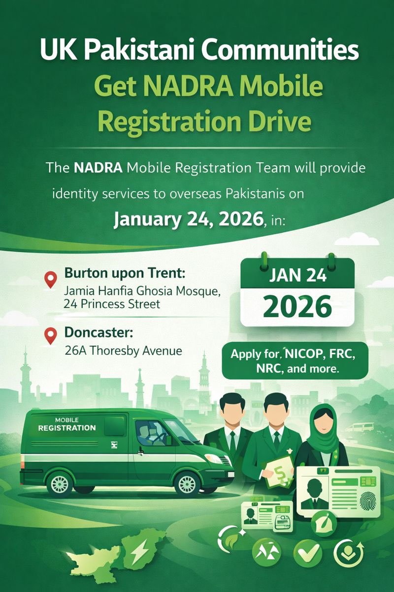 The National Database and Registration Authority (NADRA) is set to launch a Mobile Registration Drive 2026 across various cities in the United Kingdom starting January 24, 2026. This special initiative is designed to deliver essential identity and documentation services directly to overseas Pakistanis, making the process more accessible and community-focused.