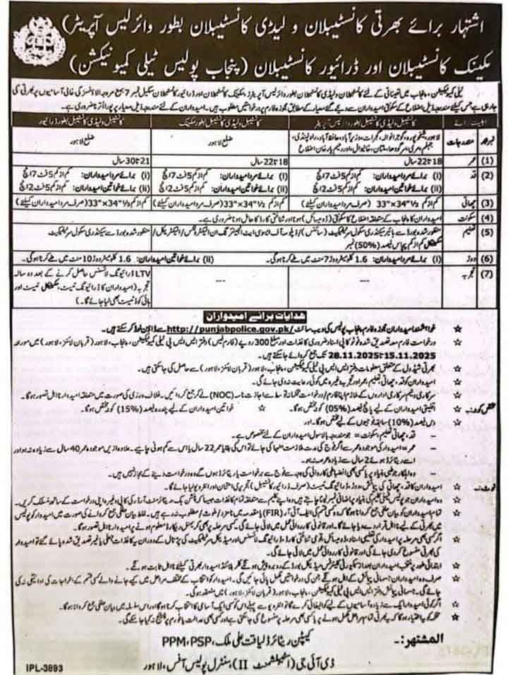 Punjab Police has announced new vacancies and is seeking applications from suitable candidates for the posts of Constable, Lady Constable, Wireless Operator, Mechanic Constable, and Driver Constable within the Telecommunication Wing of Punjab Police. This recruitment drive aims to hire capable individuals to support communication systems, technical maintenance, and operational transport duties across the department.